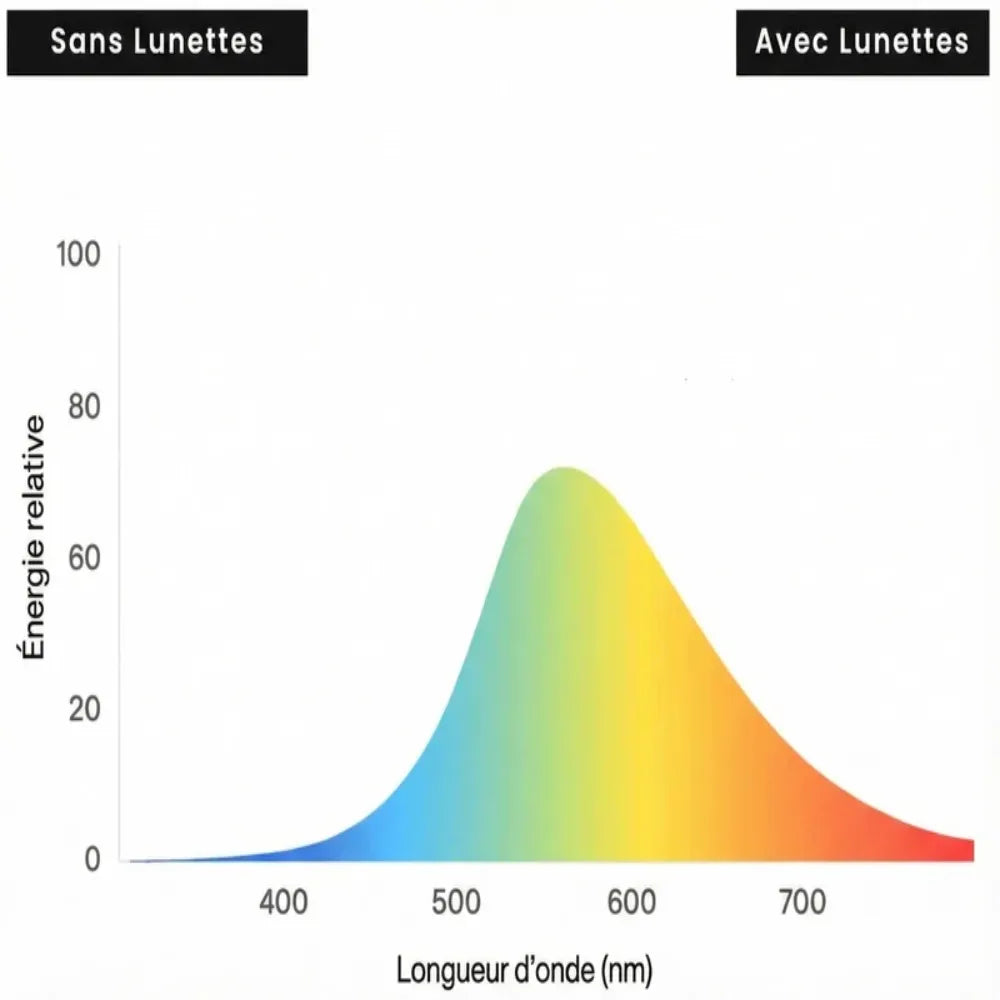 Contrairement aux verres transparents inefficaces qui filtrent à peine les longueurs d’onde nocives, celles-ci bloquent 99 % de la lumière bleue et verte (400–520 nm) afin de stimuler la mélatonine et de soutenir votre rythme circadien.